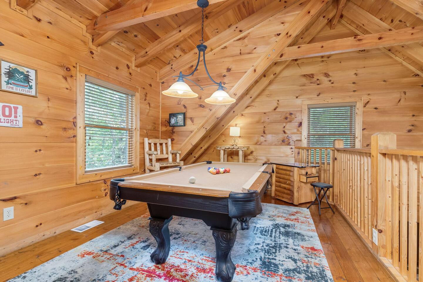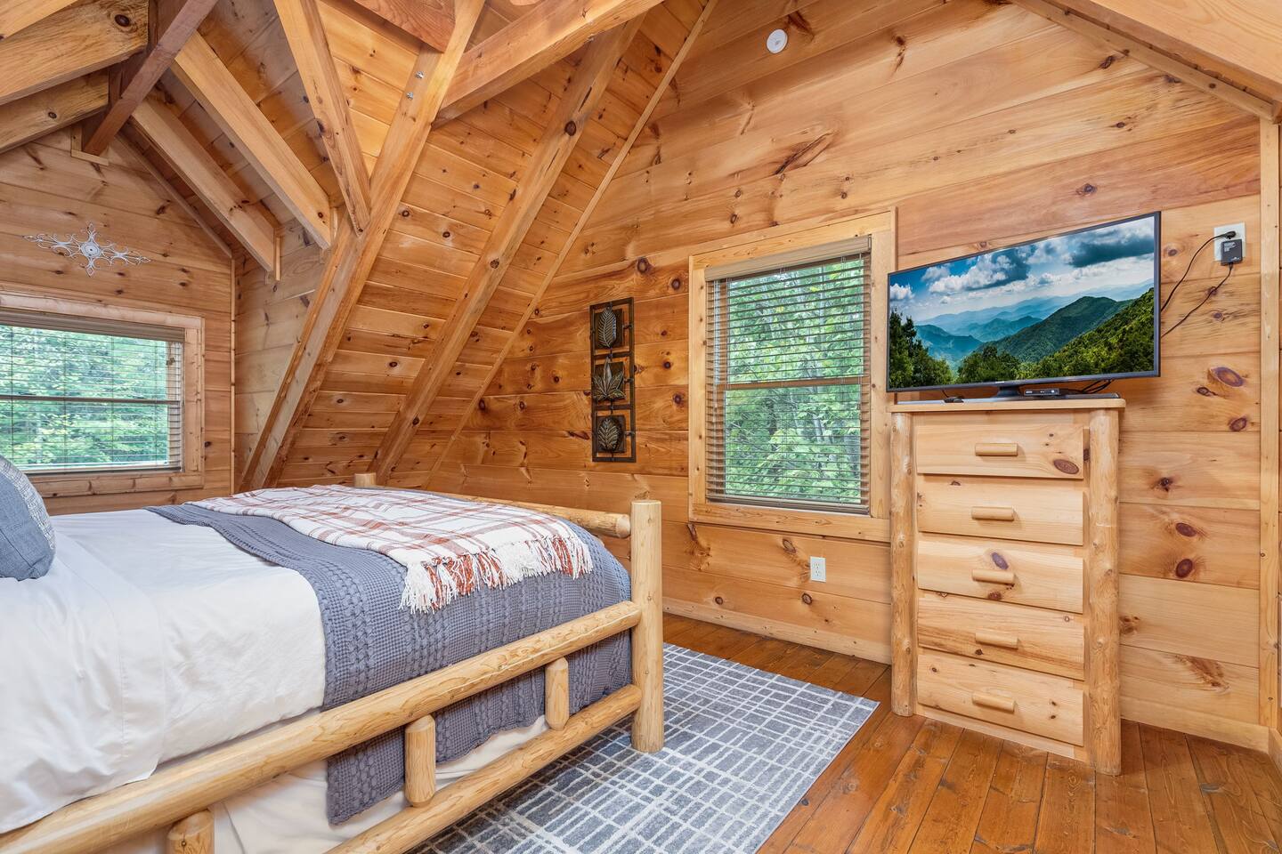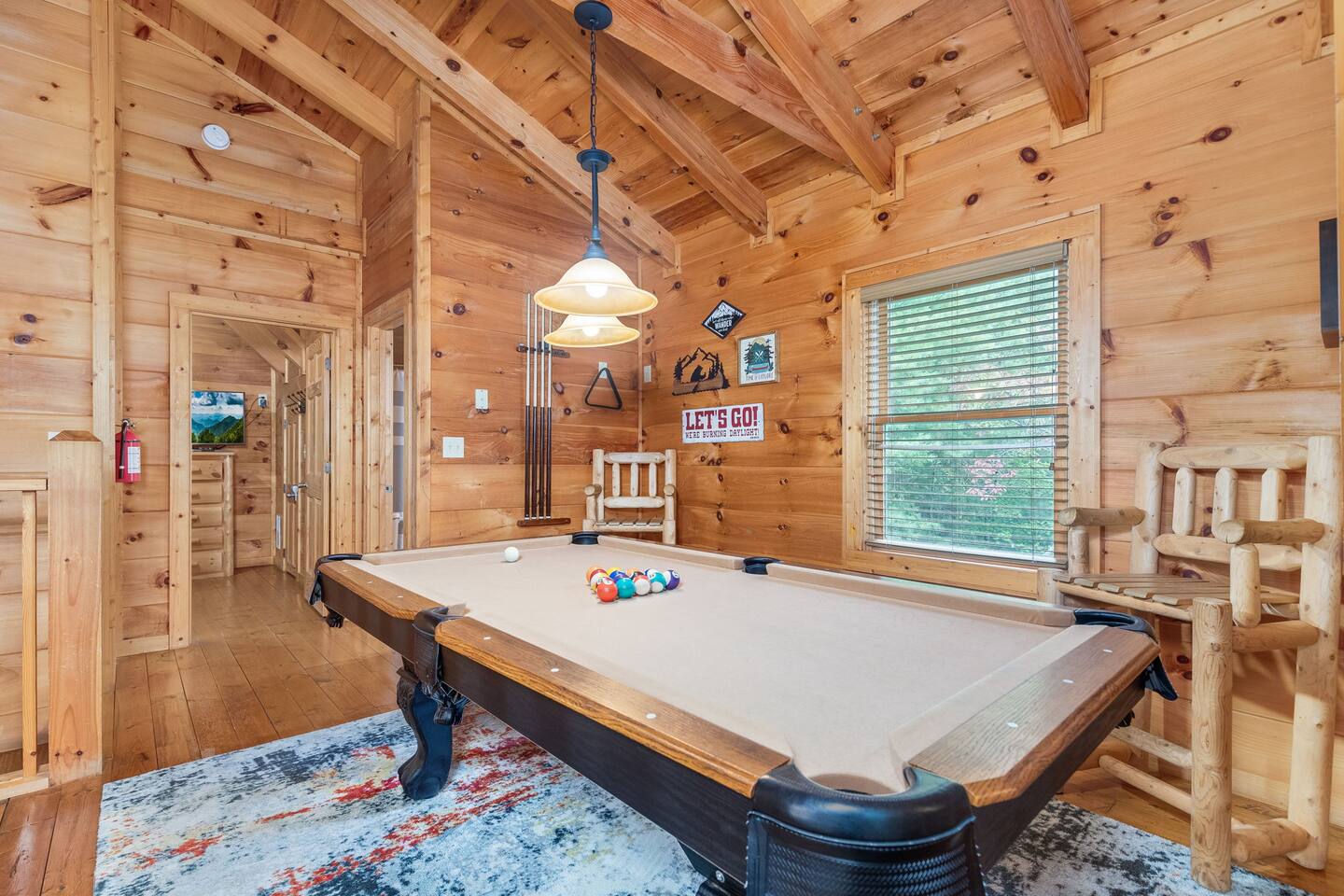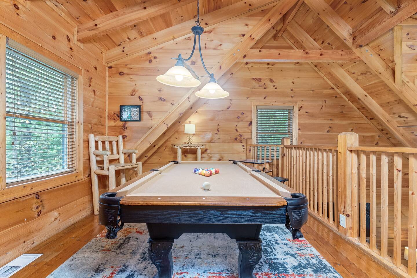 Two large, private bedrooms with private baths-- one on the main level and one of the second level -- each has king size log beds with super comfortable pillow-top mattresses which are dressed with luxurious sheets, down comforters, and quilts, TV, reading lamps, and a ceiling fan. For extra sleeping accommodations, we have a full-size sofa bed in the main living area and a pack-and-play for your infant. A high-chair is also available. We love entertainment and so will you: The cabin features high-speed internet (75 Mbps) for all your Netflix streaming and browsing needs. Plenty HD TV channels and a fully equipped Nintendo Wii with controllers, steering wheels, microphone, dance mat and much more complete our multimedia entertainment program. A pool table and dartboard make for "unplugged fun" on our spacious loft. We also provide a stocked kitchen and a barbecue grill. A compact Washer/dryer, iron and ironing board are supplied for your convenience. You will be so comfortable that you will want to stay!! Stay at Carpe Diem @ Smoky Cove and 'enjoy the day' in the Great Smoky Mountains.