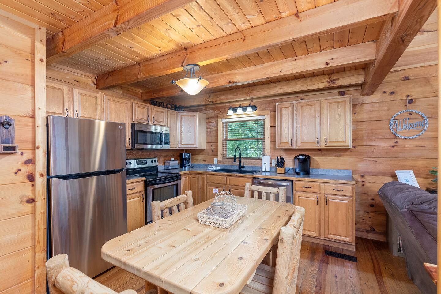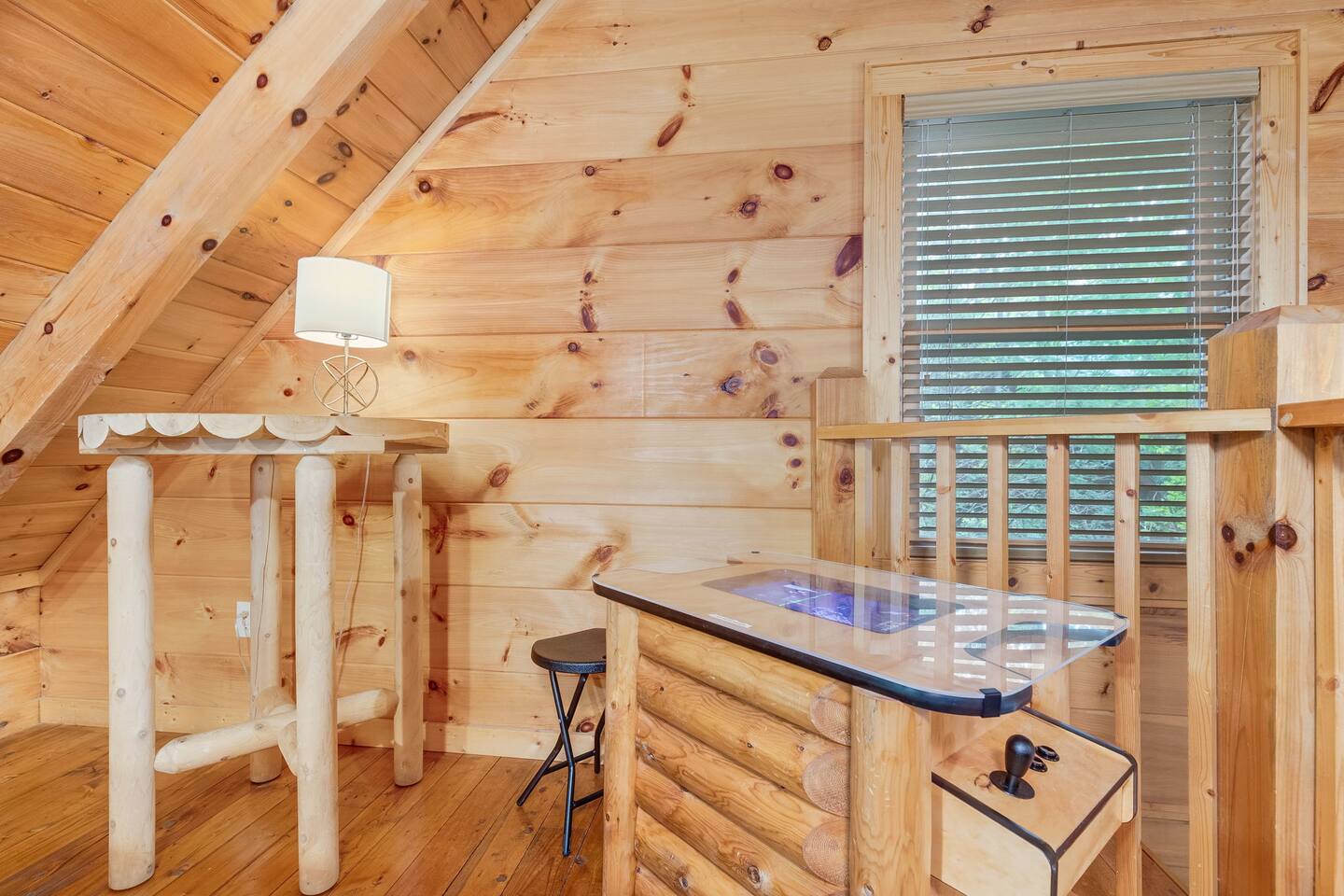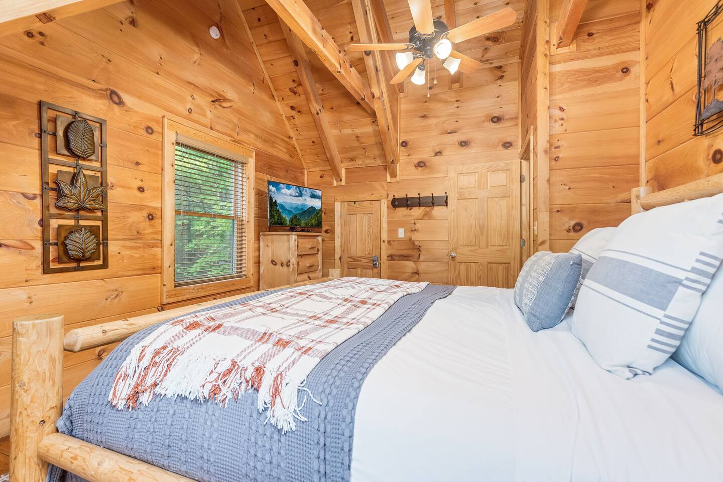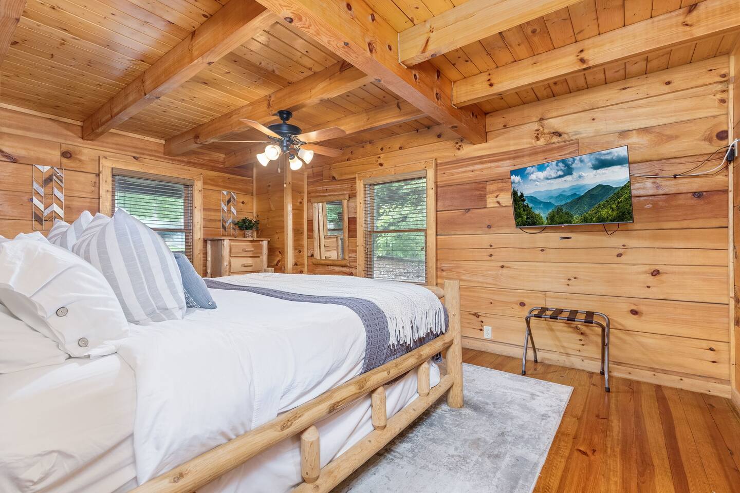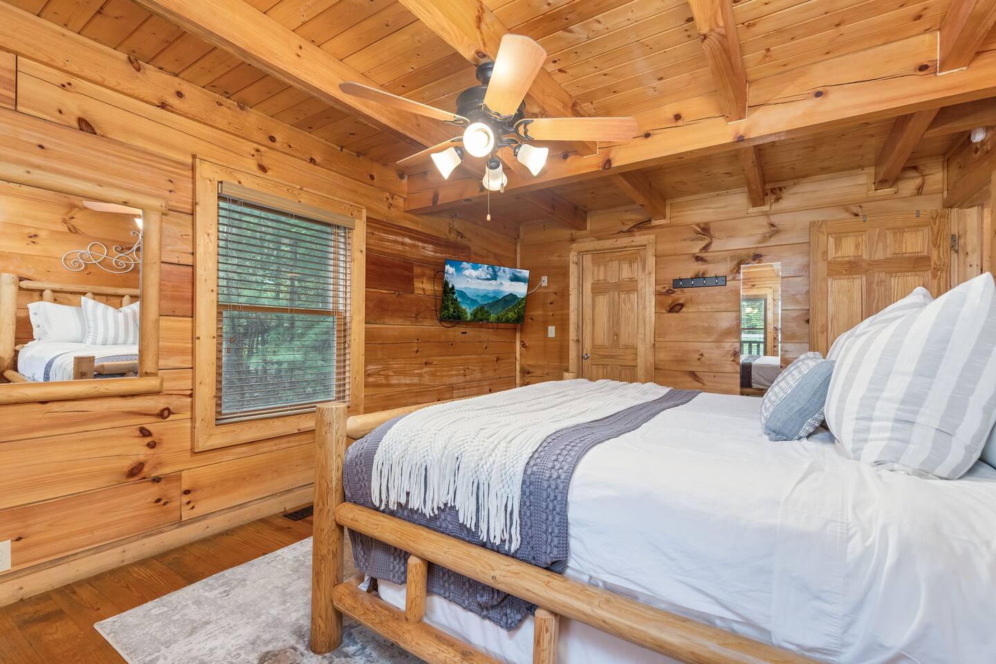 Two large, private bedrooms with private baths-- one on the main level and one of the second level -- each has king size log beds with super comfortable pillow-top mattresses which are dressed with luxurious sheets, down comforters, and quilts, TV, reading lamps, and a ceiling fan. For extra sleeping accommodations, we have a full-size sofa bed in the main living area and a pack-and-play for your infant. A high-chair is also available. We love entertainment and so will you: The cabin features high-speed internet (75 Mbps) for all your Netflix streaming and browsing needs. Plenty HD TV channels and a fully equipped Nintendo Wii with controllers, steering wheels, microphone, dance mat and much more complete our multimedia entertainment program. A pool table and dartboard make for "unplugged fun" on our spacious loft. We also provide a stocked kitchen and a barbecue grill. A compact Washer/dryer, iron and ironing board are supplied for your convenience. You will be so comfortable that you will want to stay!! Stay at Carpe Diem @ Smoky Cove and 'enjoy the day' in the Great Smoky Mountains.