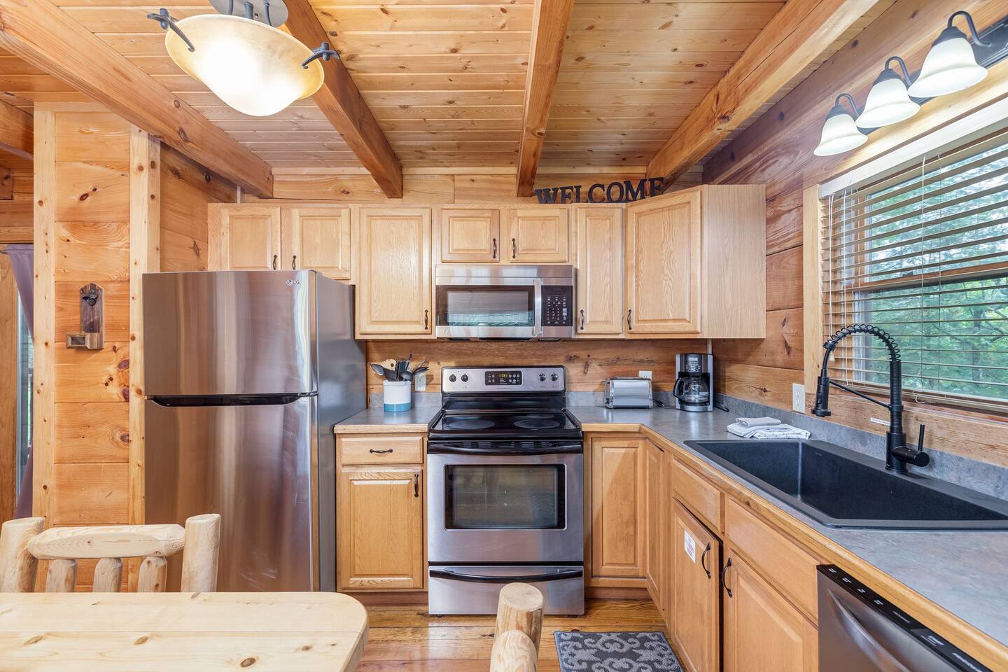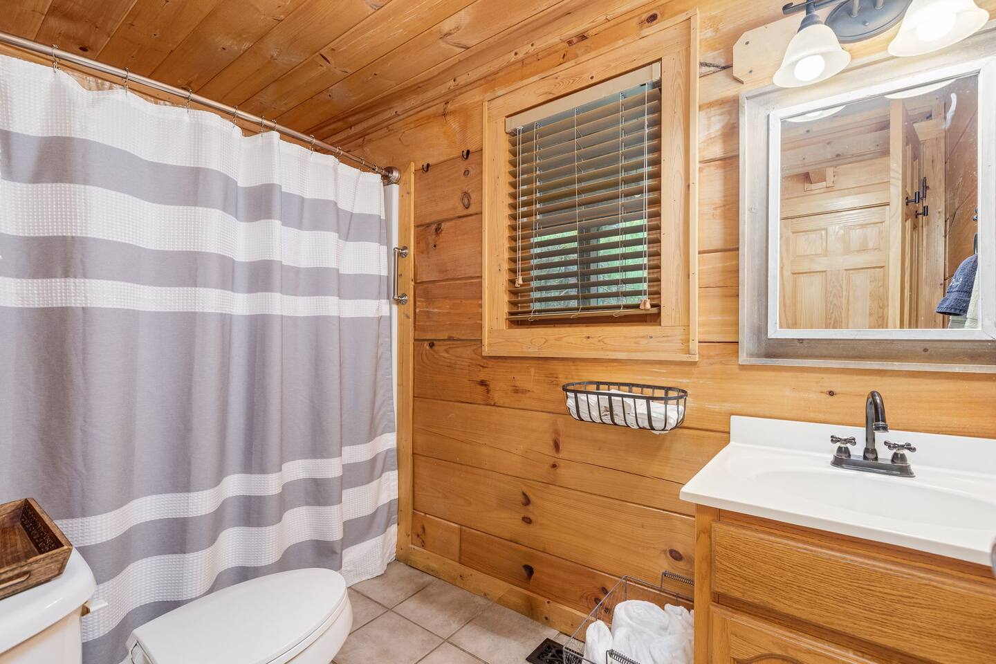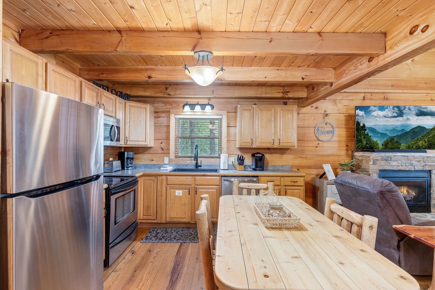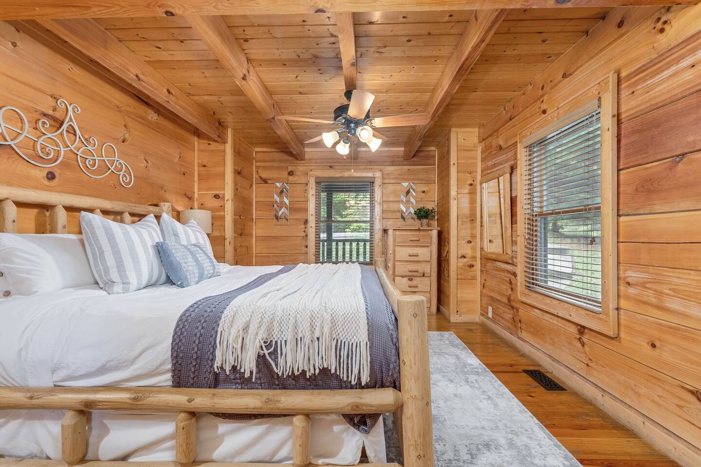 Two large, private bedrooms with private baths-- one on the main level and one of the second level -- each has king size log beds with super comfortable pillow-top mattresses which are dressed with luxurious sheets, down comforters, and quilts, TV, reading lamps, and a ceiling fan. For extra sleeping accommodations, we have a full-size sofa bed in the main living area and a pack-and-play for your infant. A high-chair is also available. We love entertainment and so will you: The cabin features high-speed internet (75 Mbps) for all your Netflix streaming and browsing needs. Plenty HD TV channels and a fully equipped Nintendo Wii with controllers, steering wheels, microphone, dance mat and much more complete our multimedia entertainment program. A pool table and dartboard make for "unplugged fun" on our spacious loft. We also provide a stocked kitchen and a barbecue grill. A compact Washer/dryer, iron and ironing board are supplied for your convenience. You will be so comfortable that you will want to stay!! Stay at Carpe Diem @ Smoky Cove and 'enjoy the day' in the Great Smoky Mountains.